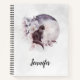 Un cuaderno en espiral con una pintura acuarela de un gato negro y un ramo floral rosa y violeta. Frente a una gran luna llena. Elegante y mágico.