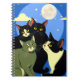 Un cuaderno con un ilustracion de cuatro gatos en el prostíbulo, con ojos brillantes, se reúne bajo un cielo nocturno, con luna llena y estrellas. El cielo es azul profundo, salpicado de nubes esponjosas.