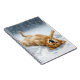 A golden retriever joyfully rolls in the snow, creating a playful snow angel while snowflakes gently fall around the happy dog.