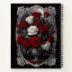 rosas rojas oscuras y blancas-grises plateadas en un florero ornamentado dentro de un marco gris oscuro y gris sobre un fondo negro para tu cuaderno de Gótico.