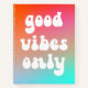 Un diseño de tipografía retro groovy "sólo con buenas vibraciones" en un naranja vívido, rosa caliente y azul acuático. Puede eliminar el degradado y utilizar un fondo en el sistema. Por ejemplo, un fondo de color sólido. Agregue su propio texto personalizado o foto para crear su propio bloc de notas en blanco.