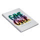 Un diseño tipográfico inspirado en juegos coloridos que presenta letras en gradiente negrita que dicen “Game Over”, acentuado con un icono de control de juego y la frase “¡Vamos a jugar de nuevo!” para un ambiente divertido y retro de jugador.