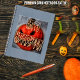 Este dibujo gráfico, editado digitalmente, para realzar, este vibrante, naranja y negro, calabaza, con amenazante, sonriente, hacia la derecha, contra un fondo azul-gris, con Happy Halloween, Emblazonado, al otro lado del frente, con letras macabras, de color pálido.