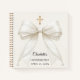 This personalized Confirmation guest book features a graceful ivory bow with pearl accents and a subtle gold cross, set on a soft ivory background for a warm, elevated look.