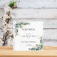 A white background color. Decorated with eucalyptus greenery and golden foliage. Add your names and wedding date. Mr Mrs and a heart written with a modern hand lettered style scrupt.