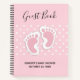 Libro de invitados para una ducha de bebé con una adorable imagen de huellas de bebé rosadas con un fuerte contorno blanco. La polka blanca se pega sobre un fondo rosado detrás del ilustracion.