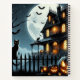 Una casa aterradora con luna llena, gato, calabazas y murciélagos