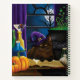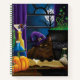 Un gato mágico de color chocolate con un corazón de bruja morado sentado en los libros. Caldero, calabazas, pociones y varas se sientan entre el gato.