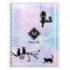 Manténgase al tanto de su apretada agenda con este portátil personalizado. Cubierta: En el centro, blanco contra negro, se encuentra la primera letra de tu nombre (en mayúsculas) dentro de un marco con forma de diamante. Bajo él va tu nombre de pila, en negro, en letras cursivas. En el fondo de una galaxia de acuarela clara hay tres siluetas: una chica y su gatito en un columpio con una flor diminuta entre ellos en la parte superior derecha; un gato paseando por la línea blanca que enmarca la cubierta; y una pareja de gatos disfrutando de la compañía del otro en una rama de árbol en la parte inferior izquierda. Tenga en cuenta que al hacer clic en el personalizar más adelante puede cambiar el tamaño y reemplazar todos los iconos, así como cambiar sus colores de relleno (que se establece de forma predeterminada como negro).