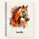 Cuaderno en espiral con una hermosa ilustración. Una cabeza de caballo castaño color marrón cobrizo y parte superior del cuerpo. Con parches de acuarela detrás.