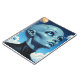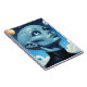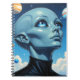 Cuaderno de fología. Una hermosa extraterrestre extraterrestre femenina con grandes ojos azules mirando hacia el espacio en las estrellas y planetas.