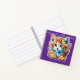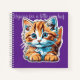 This little notebook is very colorful there is a dark purple back round and a sweet orange kitten on the front and back, the back is a lavender color. The kitten is a cartoon drawing and the kitten is waiting for mischief.