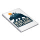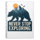Una fuerte silueta de oso que enmarca una tranquila escena montañosa con pájaros en vuelo, evocando una sensación de aventura y libertad. "NUNCA DEJE DE EXPLORAR" enfatiza la resiliencia y el descubrimiento.