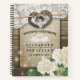 Plantilla de libro de visitas de estilo rústico-Boda de estilo rústico - Corazón de herradura antigua con nudo de abertura y encaje blanco, Flor de hidrangea, luces de cuerdas y tela de arpillera sobre fondo de madera de antiguo granero. Un diseño perfecto para tu gran día. ¡Todo el estilo de texto, colores, tamaños se pueden modificar para adaptarlo a sus necesidades!