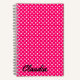 This notebook features white polka dots on a hot pink background. Name in script text can be personalized.