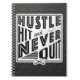 Hustle Hustle de Hockey sobre hierba y nunca deje el Bloc de notas. El texto dice: Hustle, Hit And Never Quit, con un icono cruzado de bastones de hockey sobre hierba.