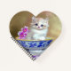 Un portátil con un gatito blanco esponjoso. El gatito de ojos azules se sienta en un tazón azul con flores rosas. Una manta morada con flores está cubierta por delante. Un regalo maravilloso para los amantes del gato y del arte victoriano.