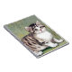Un ordenador portátil con gatito a rayas. Hay rayas negras que cruzan la piel de un gatito blanco. Una flor blanca decora una cesta en un campo de hierba. ¡Un regalo fantástico para los amantes del gato y del arte victoriano!