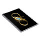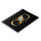 Oro, símbolo brillante de infinito, decorado con una pluma de pavo real de joyas con un fondo turquesa en negro.