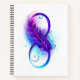 Símbolo infinito con una hermosa pluma pintada de color violeta y azul brillante sobre fondo blanco.