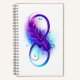Símbolo infinito con una hermosa pluma pintada de color violeta y azul brillante sobre fondo blanco.