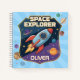 Este divertido bloc de notas personalizado cuenta con una insignia de explorador de espacios en negrita. En el centro de la insignia hay un lúgubre cohete personalizado que se esparce por el espacio con planetas orbitando a su alrededor.