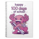 Diseño adorable con un ajolote que lleva una mochila y sostiene una pluma grande con la cita "Feliz 100 días de escuela". Feliz 100º día de escuela o jardín de infancia.