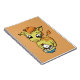 Una jirafa amarilla y anaranjada colorida que sonríe feliz abajo en una fractura de plátano en un cuenco azul.