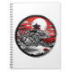 Ilustracion de un jardín japonés con árboles, estanque, rocas y una pagoda de colores rojo, blanco y negro rodeados de un círculo negro gris