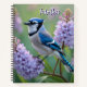 Un cuaderno de doble cara. Puede elegir cómo se ven las páginas interiores. Cada lado tiene un Jay azul sentado en arbustos de lilas. ¡Añade tu nombre en el área de personalización!