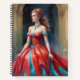 La princesa luce un vestido rojo con toques de azul cielo, un conjunto lujoso que combina pasión y serenidad en una figura majestuosa.