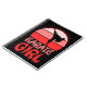 Diseño retro de puesta de sol divertida en tonos rojos hasta rosados, con chica de karate pateado en silueta. Con una gran fuente ornamental debajo diciendo: "Chica Karate" y la frase clave, "Me echan una patada" en texto rojo curvado alrededor de la parte superior.