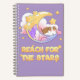 Eine süße Katze sitzt auf einem Mond mit Wolken im Hintergrund und einem sehr niedlichen Zitat: „Greife nach den Sternen“.