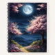 Los árboles que bordean un camino de piedra florecen rosados, enmarcando una luna llena de flores, en este hermoso cuaderno de espiral. Perfecto para quien ame las flores y los jardines.