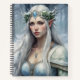Una majestuosa reina del invierno se presenta coronada de nieve, con cabello blanco y vestido blanco que brillan como la escarcha. Un diseño que evoca la serenidad y la autoridad de una monarca invernal.
