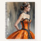 Una princesa en un vestido naranja y negro bordado de gemas brilla con intensidad y pasión, plasmada en acuarela con una mezcla de energía y lujo. ¡Una obra de arte que evoca la fuerza y la majestuosidad!