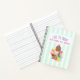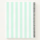 Cita divertida de cuaderno de espiral con un ilustracion de 3 helados de cuchara con rociadas de colores. Un cono de helado con cucharas de chocolate, fresa y vainilla. Un bol de helado neopolitano con una cereza encima. Fresas y una piña se sientan al lado de las cuencas. Patrón de rayas blancas y verdes en el fondo.