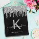 Un fondo negro de moda con detalles modernos de purpurina de plata falsa, pinturas con aspecto de goteo. Personalice y agregue un nombre, su letra de monograma y un título. El nombre está escrito con un gran guión de estilo moderno y con letras a mano con toques. Para que los cambios sólo eliminen el nombre del ejemplo, deje los espacios o la emoji delante y después del nombre. Texto en blanco y gris. Un bloc de notas con páginas en blanco. Utilícelo como un cuaderno de bocetos, para garabatear, dibujar notas, para la escuela o el trabajo.