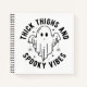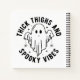 Este divertido y espeluznante diseño de Halloween incluye la frase "Thick Thighs and Spooky Vibes", distribuida en forma circular alrededor de un ilustracion fantasma clásico y bonito. El fantasma, con sus ojos simples pero expresivos, es el foco central del diseño, dándole una vibración lúdica y lúdica. De las manos del fantasma cuelgan dos pequeñas arañas, que le dan un toque de incomodidad al diseño, por lo demás, alegre. El texto es audaz y limpio, lo que crea un fuerte impacto visual y mantiene un tono lúdico. La combinación de colores blanco y negro le da al diseño un aspecto atemporal y versátil, lo que lo hace perfecto para Halloween.