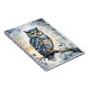 Un búho majestuoso encaramado en una rama en un bosque sereno y nevado. Los sorprendentes ojos naranjas de la lechuza destacan en contra de sus plumas azules, adornadas con patrones intrincados que se asemejan a copos de nieve. El fondo está formado por árboles desnudos con nieve, y el suave resplandor del sol se filtra a través de la niebla, añadiendo una calidad mística a la escena. El conjunto es tranquilo y encantador, lo que confiere a la belleza de un bosque invernal.