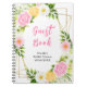 Este hermoso y elegante libro de invitados de la despedida de soltera presenta flores de acuarela rosas, amarillas y blancas con follaje en un marco geométrico dorado. El texto combina la letra manuscrita y las fuentes serif para un estilo moderno y elegante. Esto es perfecto para una despedida de soltera rústica de primavera o verano.