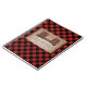 Ilustracion de un par de botas de bebé entre dos pares de botas de excursión adultas con cordones rojos dispuestos en forma de corazón. El fondo está inspirado en el material de cartón con borde de manto rojo y negro de búfalo. El texto rojo de arriba dice: "Comienza la aventura"