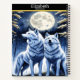 Dos lobos magníficos se paran en un bosque iluminado por la luna, con su piel lujosa brillando bajo el espléndido resplandor de una luna llena. Rodeados de altos árboles y un cielo estrellado, se unen a un audaz aullido, que hace eco de la belleza salvaje de la noche. NOTA Para Cambiar El Texto Utilice La Herramienta Editar Uso Del Diseño