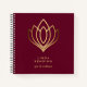 Moda y cuaderno elegante con un ilustracion de Relieve metalizado de oro falso de flor de loto sobre un fondo RUBY RED clásico. Personalice con dos líneas de texto personalizado debajo. Colección de negocios del logotipo de Coordenadas a Gold Lotus