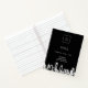 Un fondo negro, con una silueta de ciudad moderna y abstracta en blanco como decoración. Personalice y agregue el logotipo de su empresa, nombre e información de contacto.