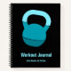 El Cuaderno de Entrenamiento de Logo Negro Azul Eléctrico Intenso, parte de la colección "Tarjetas de Negocio y Marketing de Fitness Azul Eléctrico", tiene una cubierta negra y azul energética con una pesa rusa. A lo largo del borde inferior, el propósito del planificador está escrito en tipografía sans serif moderna. Debajo hay un espacio para una etiqueta, como "Entrena Más Fuerte. Ve Más Lejos".