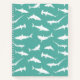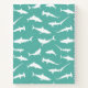 Increíble cuaderno impreso con un diseño gráfico de un frenesí de tiburones. Tiburones blancos nadando en un fondo azul. El diseño incluye martillo, tiburones tigres, grandes blancos y Threshers.