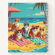En una playa soleada, repartidas en cinco elegantes gatos, te relajarás en unas toallas a rayas bajo las palmeras. Llevan coloridas gafas de sol y gorras de paja, disfrutando de unas vacaciones tropicales, con un mar turquesa y un brillante cielo azul detrás de ellos.