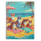 Un ordenador portátil de cinco elegantes gatos se relaja en una playa soleada, sobre toallas a rayas bajo las palmeras. Llevan coloridas gafas de sol y gorras de paja, disfrutando de unas vacaciones tropicales, con un mar turquesa y un brillante cielo azul detrás de ellos.