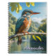 Un cuaderno de diseño encuadrado en espiral, con una imagen de portada de un majestuoso kingfisher junto al río. La tranquila escena muestra el pájaro colorido sentado en una rama, con luz solar en las hojas, añadiendo un toque de la naturaleza a los materiales de papelería. Personalice el bloc de notas con un nombre en una tipografía de escritura elegante. Un regalo ideal para los amantes de la naturaleza y la vida salvaje.